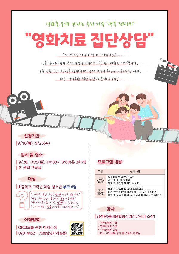 '영화를 통해 만나는우리 가족 행복레시피' [영화치료 집단상담 참여자 모집]